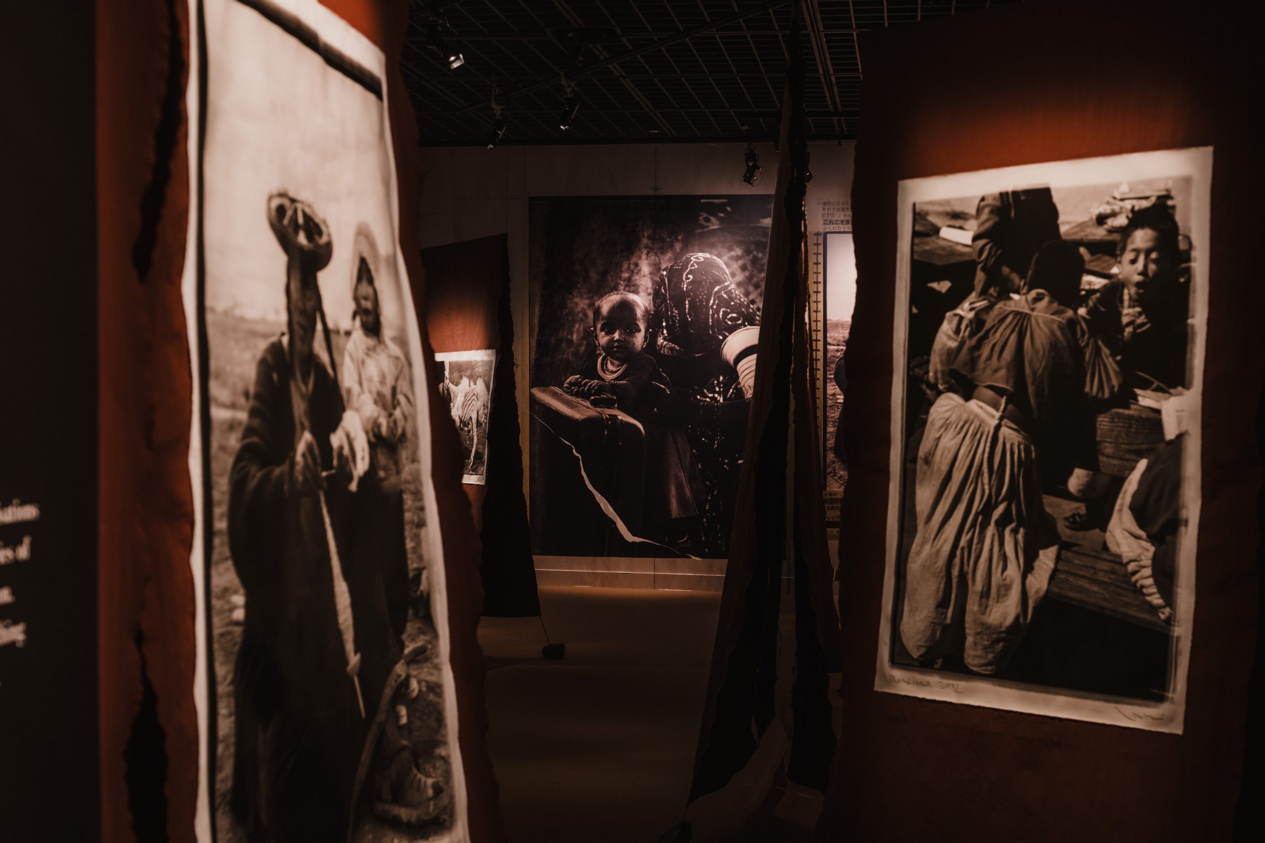 照明を落とした会場に足を踏み入れる。床は赤褐色の大地を思わせ、テントのような布がゆるやかに立ち上がっている。布はかすかに揺れ、その表面には竹和紙にプリントされた写真が縫いつけられていた。