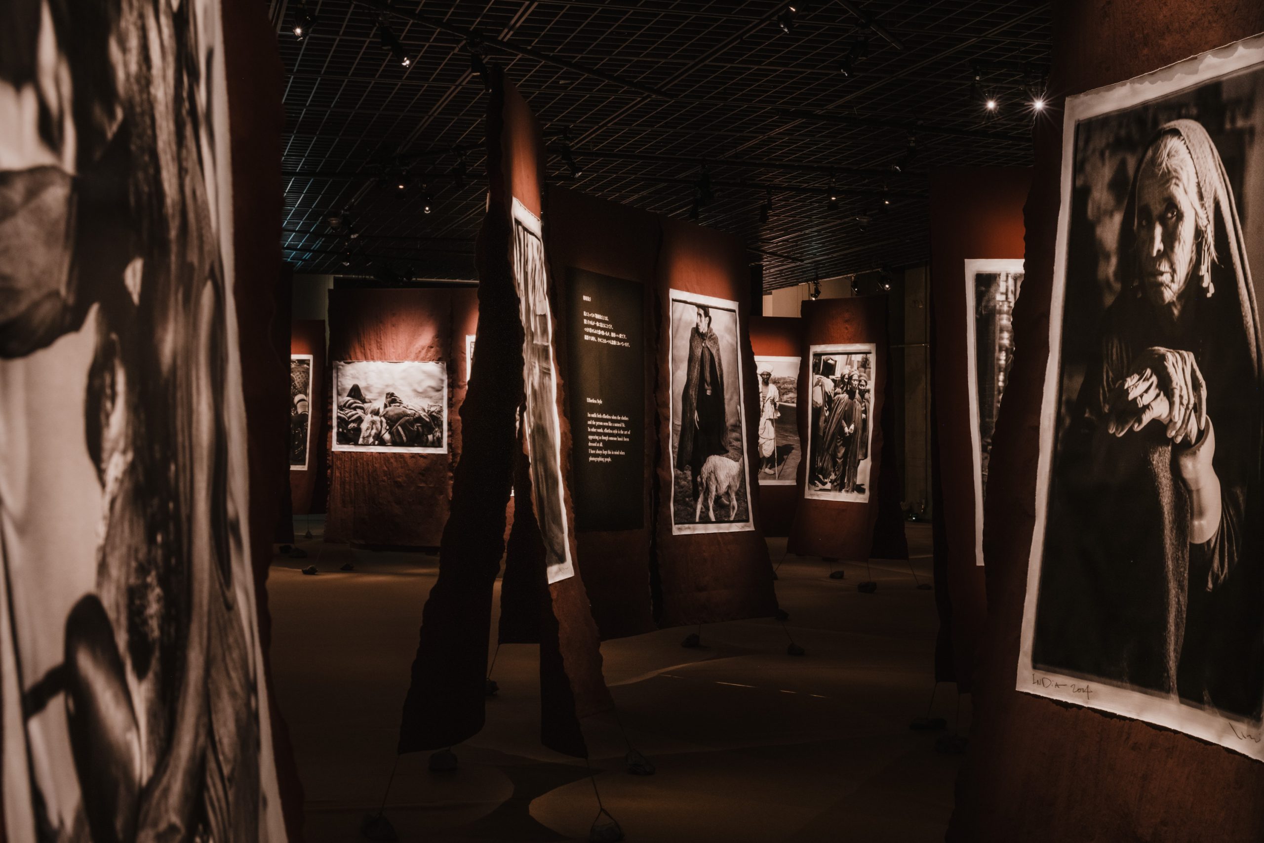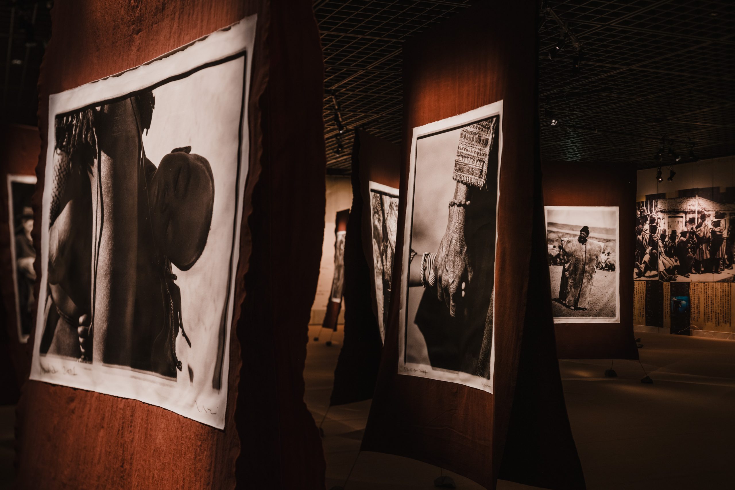 会場構成を手がけたのは、パリを拠点に活動する建築家・田根剛。中央には「広場」と呼ばれる一際大きなヴィレッジがあり、ロバやラクダ、羊など動物と共に生きる人々の姿を捉えた作品が集まる。照明はゆっくりと明暗を変え、朝から夜へと移り変わる時間の流れや雲の影を表現し、空間全体が“村の一日”のような気配を帯びていく。