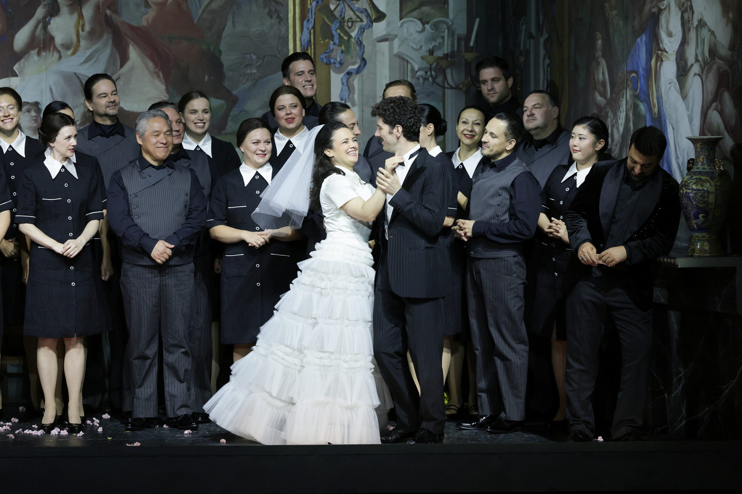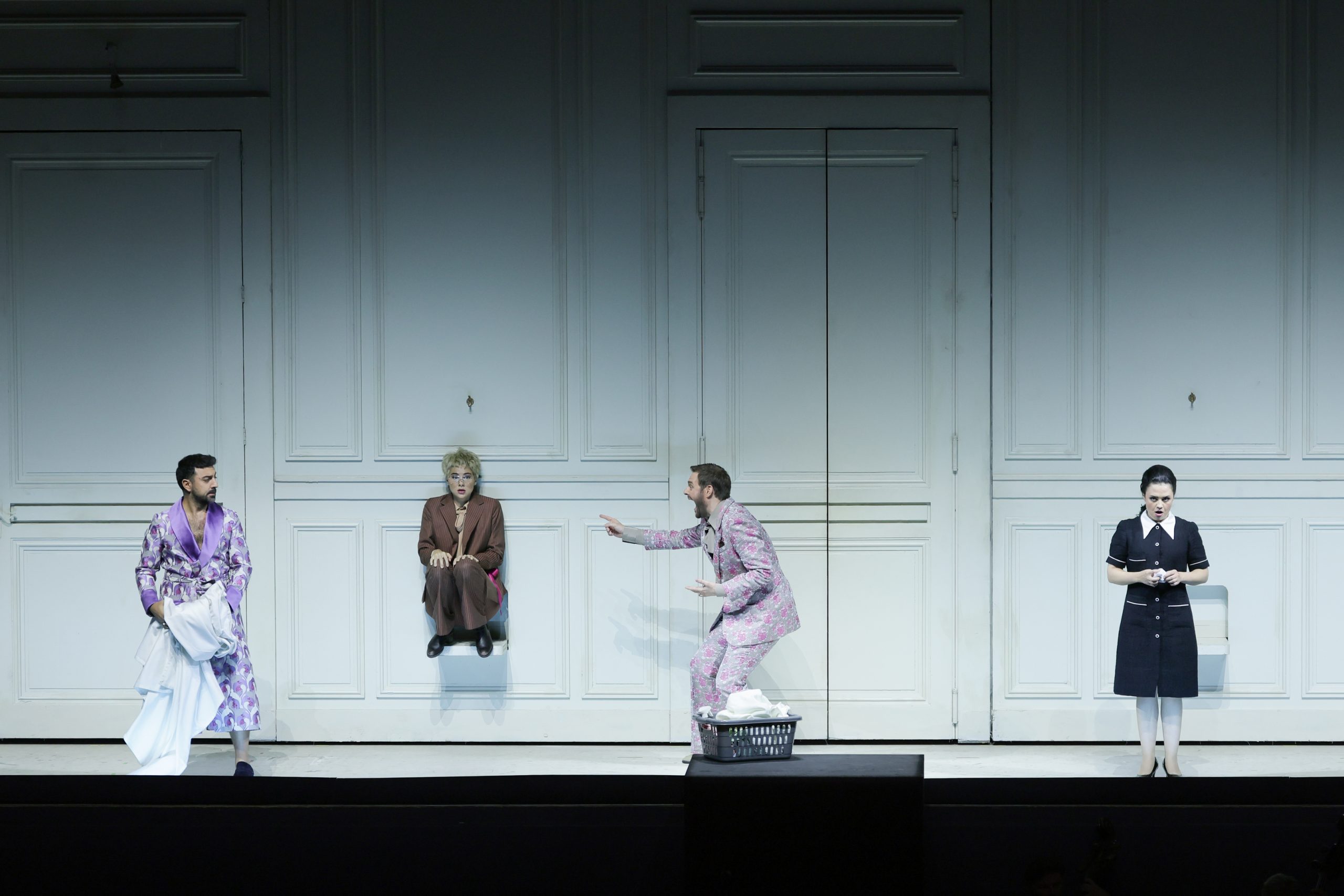 伯爵夫人(ハンナ=エリザベット・ミュラー)の黄色のふんわりしたローブ、ケルビーノ(パトリツィア・ノルツ)の軍服の明るい青、おしゃれなメガネをかけたマルチェリーナ(ステファニー・ハウツィール)のファッショナブルな若々しさ。一方のスザンナ(カタリナ・コンラディ)は地味な制服の女中であり、モップをかける掃除婦。そこには色彩のコントラストだけでなく、台本作者のダ・ポンテが意識していたであろう、階級と貧富の差が容赦なく可視化されていた。