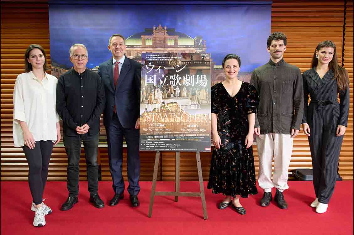 開幕記者会見にて。左より、ハンナ=エリザベット・ミュラー(伯爵夫人役)、ベルトラン・ド・ビリー、ボグダン・ロシチッチ総裁、カタリナ・コンラディ(スザンナ役)、リッカルド・ファッシ(フィガロ役)、パトリツィア・ノルツ(ケルビーノ役)