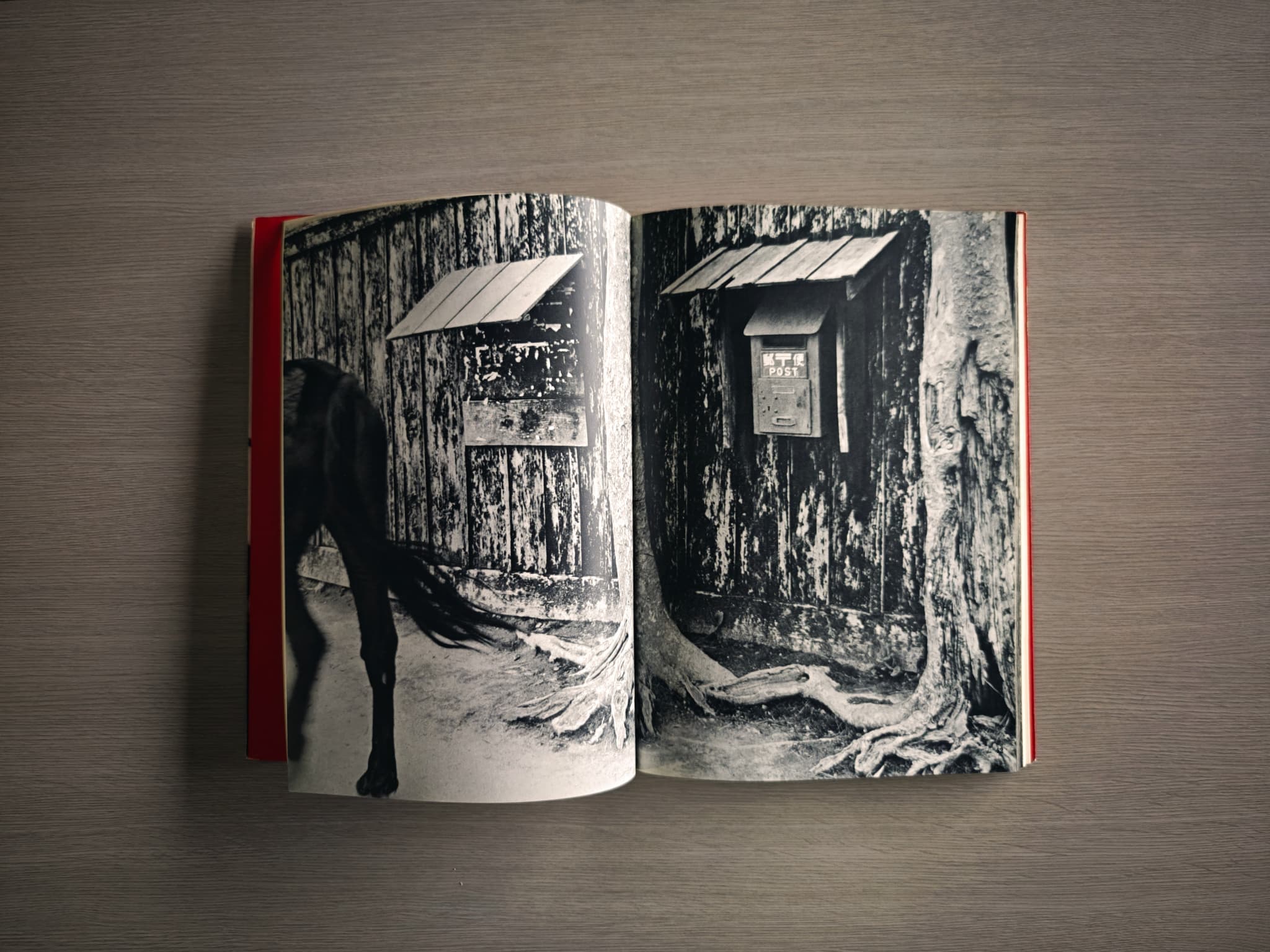 木村さんの写真で同じように焦点が分散していく感じがするのは、戦後の写真集『秋田』に収められている〈青年〉と〈塀〉という、どちらも有名な作品だ。〈青年〉は、純朴と生意気が入り混じった三人の青年の視線がまったく違う方へ向けられた不思議な作品。〈塀〉は、画面全体に映されているのは歴史を刻んだ板塀である。板塀前の右端と中央には地表にゴツゴツと根を出した幹が1本ずつ、左端には板塀の前を通り過ぎる馬の尻尾だけが写っている。板塀と木の力強さとは対照的に、外へ出ていく馬の尻尾の軽妙さといったらない。