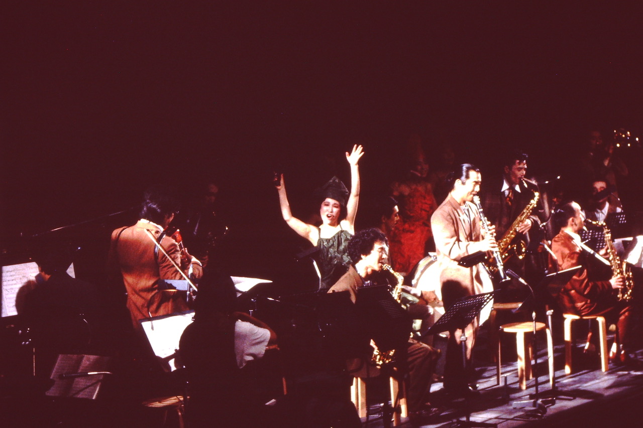 稽古中だった『上海バンスキング』のカーテンコールで演奏する「シング・シング・シング」を生演奏することを思いついて、テープに録音して勘九郎さんの楽屋に駆けつけた。ちょうど昼と夜の公演の間の休憩時間で、勘九郎さんは鰻を食べていたけど、テープを聴きながらすぐに立ち回りの動きを始めた。お箸を振り回しながら。「これ! これでいこう! サイコー!」と。千秋楽のカーテンコールになったら、討ち入り太鼓にも似たドラムの音に続いてぼくらバンスキングバンドのメンバーが、縞のシャツに蝶ネクタイの上にボール紙で作った裃をつけて出てくる。みんなが舞台中央に揃うとお馴染みのメロディを吹き始める。そしてジャズのリズムに乗って、勘九郎さんと橋之助さんが水の中で大立ち回りを始める。最後の最後は直前に打ち合わせをして、勘九郎さんが手招きをすると、ぼくが後ろ向きに引っ張られて水の中にバッシャーンと落ちる。はじめは驚いていたお客さんたちも、翌月に『上海バンスキング』の幕が開くことを知っているから、大喜びでした。