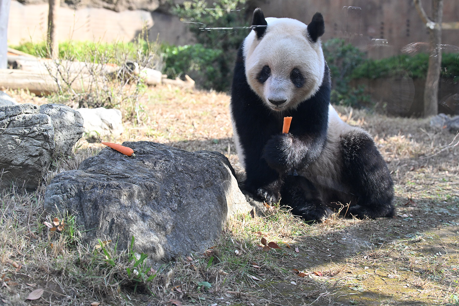 竹を少し食べたあとお庭に出てにんじんゲット。
